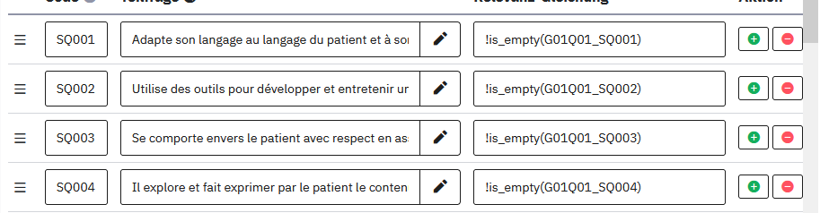 J'avoue par contre ne pas bien comprendre la deuxième réponse pour les champs courts, car j'ai l'impression dans l'exemple que vous me donnez qu'il s'agit d'une autre question, or dans mon cas il souhaiterait que dans la question de type "Tableau", il y ait une zone de commentaire pour chaque item sélectionné. Je ne comprends pas où mettre le code "!is_empty(Q1_SQ00x)"