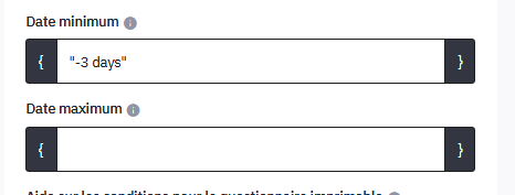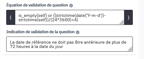 Qui a écrit qu'il fallait saisir cette information lors de la "equation de validation de question" ?date qui se nome G2Q00019 j'ai implémenté le code "-3 days" dans Équation de validation de question, rien ne se passe quelque soit la date renseigné dans le calendrier