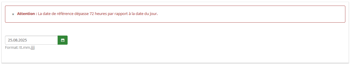 {if(!is_empty(self) and (strtotime(date('Y-m-d'))-strtotime(self))/(24*3600)>3,'<div class="alert alert-danger alert-dismissible fade show" role="alert"><strong>Attention :</strong> La date de référence dépasse 72 heures par rapport à la date du jour.<button type="button" class="btn-close" data-bs-dismiss="alert" aria-label="Close"></button></div>','')}