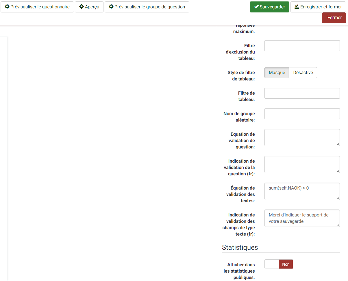 As relatively fresh french new user, I am just now messing with the question validation settings for my surveys. Please forgive my vocabulary as my Limesurvey installation in set in french and I am not a native speaker.