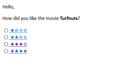 <label> <input name="rating" type="radio" /><a href="https://www.mysurvey.de/limesurvey/index.php/793813?newtest=Y&rating=1"> ★☆☆☆</a> </label><br /> <label> <input name="rating" type="radio" /><a href="https://www.mysurvey.de/limesurvey/index.php/793813?newtest=Y&rating=2"> ★★☆☆</a> </label><br /> <label> <input name="rating" type="radio" /><a href="https://www.mysurvey.de/limesurvey/index.php/793813?newtest=Y&rating=3"> ★★★☆</a> </label><br /> <label> <input name="rating" type="radio" /><a href="https://www.mysurvey.de/limesurvey/index.php/793813?newtest=Y&rating=4"> ★★★★</a> </label>
