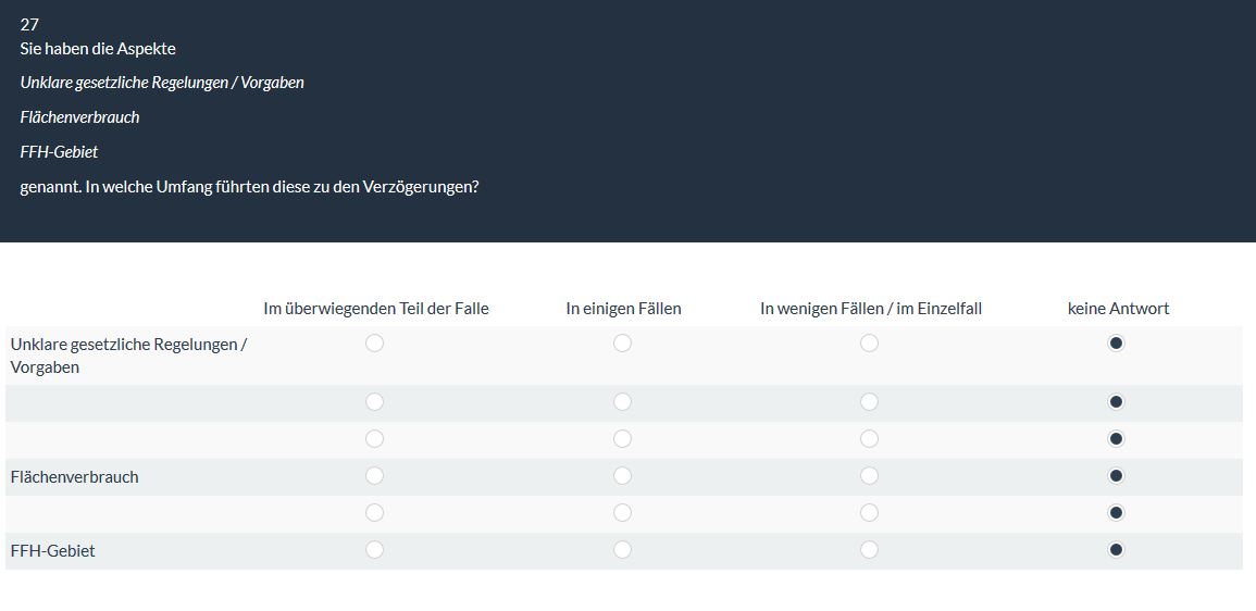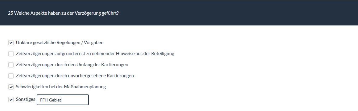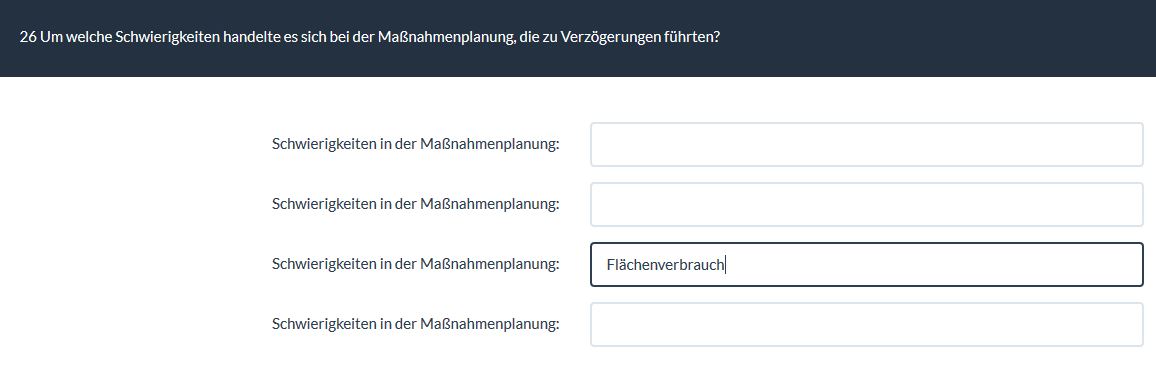 Frage 26 (Mehrere kurze Texte) ploppt nur auf, wenn bei der vorgerhigren (Frage 25) die Antwortmöglichekit "Schwierigkeiten bei der Maßnahmenplanung" gewählt wurde.