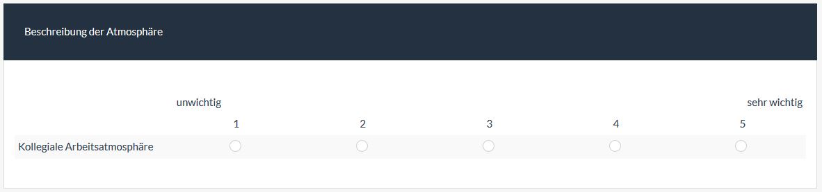 <script type="text/javascript" charset="utf-8"> $(document).ready(function(){ // Identify this question var thisQuestion = $('#question{QID}'); // Insert the new header row $('table.array-no-dropdown thead', thisQuestion).prepend('<tr class="array1 dontread">\ <td>&nbsp;</td>\ <th colspan="5"><div style="width:100%; float: left"><div style="width:50%; text-align: left; float: left">unwichtig</div><div style="width:50%; text-align: right; float: left">sehr wichtig</div></div></th>\ </tr>'); }); </script>