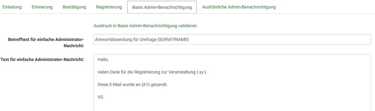 Dann unter Umfrage-Einstellung -> Basis-Admin-Benachrichtigung nach Belieben den Text ändern, Verweise per Ausdrucksmanager sind hier auch möglich { xy } steht für ein beliebigen Fragencode wie {B1} {X1}: