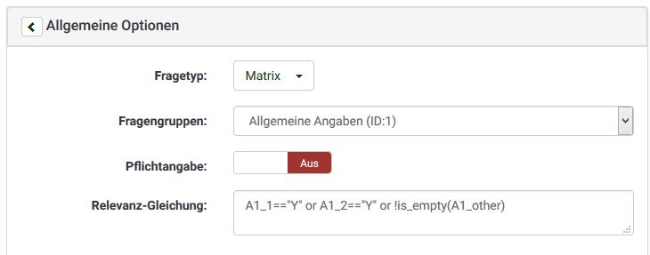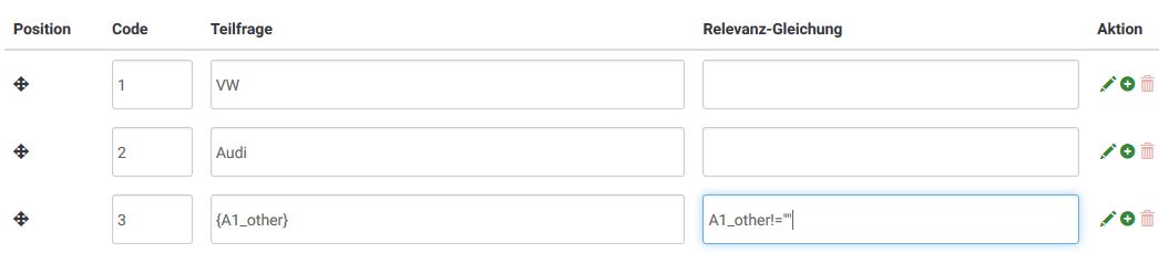 Jedoch kann ich keine Bedingung angeben, sodass der Text aus der Freitextzeile ebenfalls übernommen wird, sofern dieses markiert/angekreuzt wurde. Dies hängt vermutlich damit zusammen, dass kein Code für diese Teilfrage existiert (denn die Beschriftung für "Anderes-Option" erfolgt ja über die erweiterten Einstellungen).