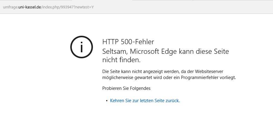 Ich habe die Fragegruppe, auf welche die Umfrage springen sollte, es dann aber nicht tut, gelöscht. Beim Testen ging dann gar nichts mehr. Statt der Umfrage erschien folgende Fehlermeldung: