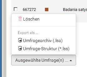 Exporte des Fragenbogens sind extrem wichtig. In Zukunft stets machen. Vermutlich geht es um eine Abschlussarbeit. Vielleicht gelingt Dir ein Export via Umfragenübersicht. Du hakst die Umfrage an und nutzt das Menü am unteren Ende (siehe Screenshot anbei). Danach kannst Du die Umfrage neu anlegen. Den Administrator würde ich auf jedenfalls informieren. Falls der Server eine Macke hat, wäre es für eine Befragung im Rahmen einer Abschlussarbeit ärgerlich, wenn weitere Probleme auftauchen.