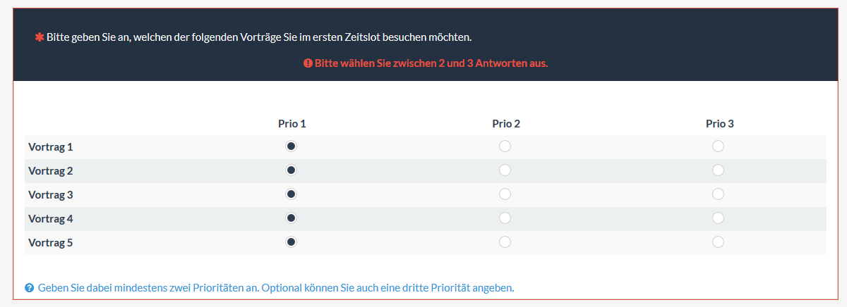 Falls Variante 1 weiterhin nicht passt, stellt sich die Frage, ob Matrix auf Mobilgeräten nicht auch unübersichtlich wird. Es hängt ein wenig von der Textmenge ab, die für jeden Vortrag dabei stehen muss. Eine Matrix mit Dropdownfeldern ginge z.B. auch.