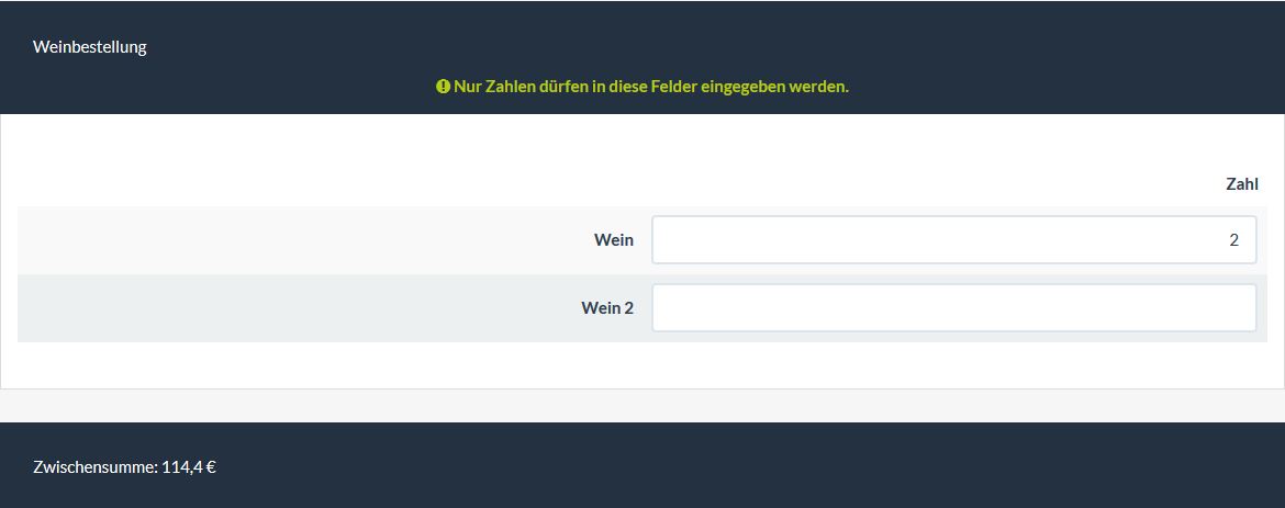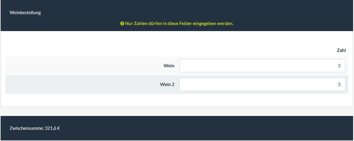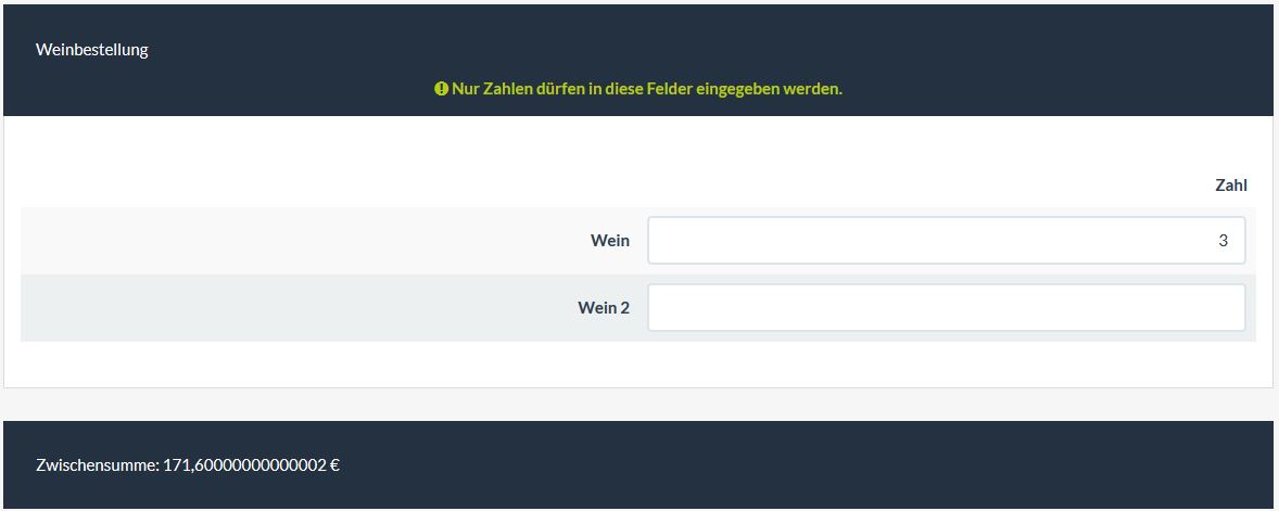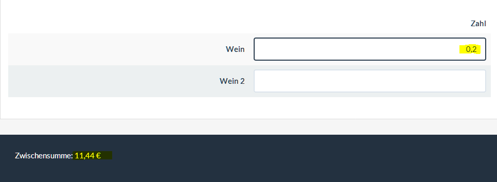 In einer Matrix kann man (nur) Zahlen eingeben, diese werden mit dem Preis multipliziert. Das Ergebnis wird in einem (eigenen) Ausgabefeld angezeigt.