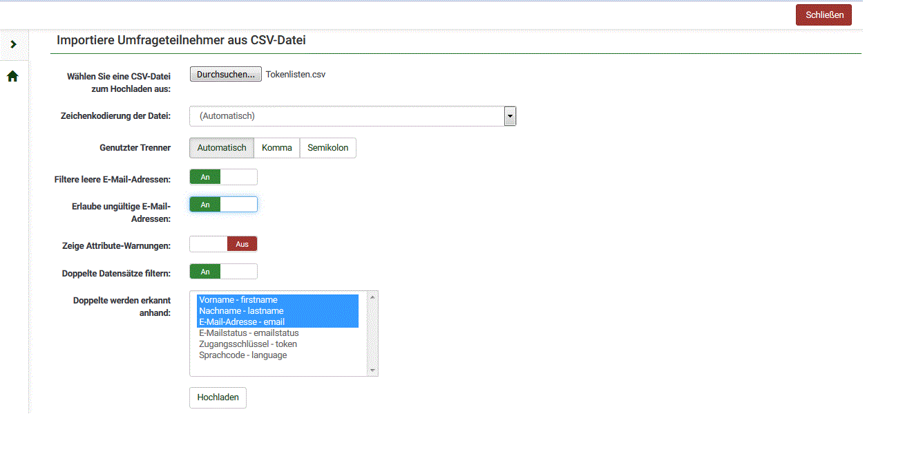Mit der Original-Datei wurden alle Datensätze importiert, aber die Token-Spalte blieb leer.