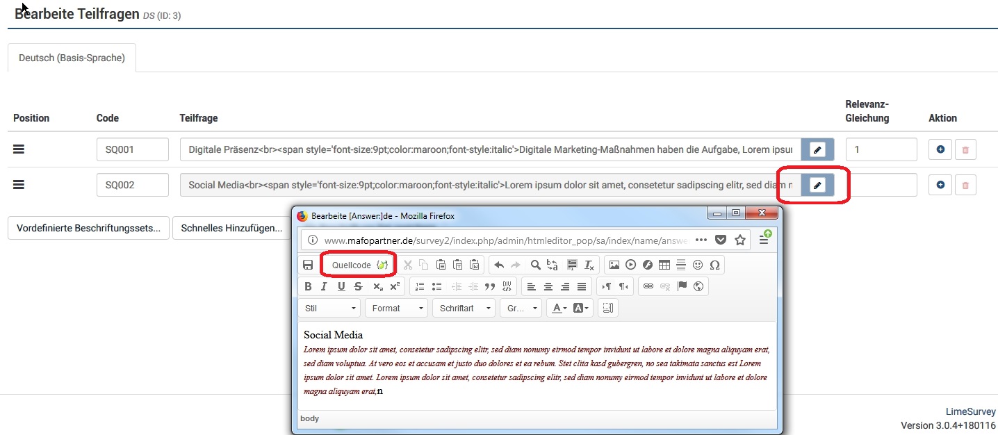 die Antwort auf die Frage warum ich keinen Quellcode bei den Unterfragen habe ist folgende: Weil ich ein Trottel bin und mich Nüsse in LimeSurvey auskenne ;-)