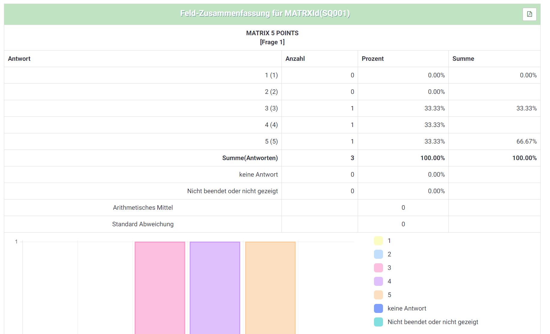 Nutze ich den Fragetyp Matrix 5er Skala werden in der Auswertung zwar Arithmetisches Mittel angezeigt, erhalten jedoch stets den Wert 0 (siehe Screenshot)