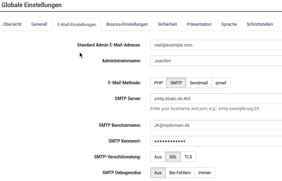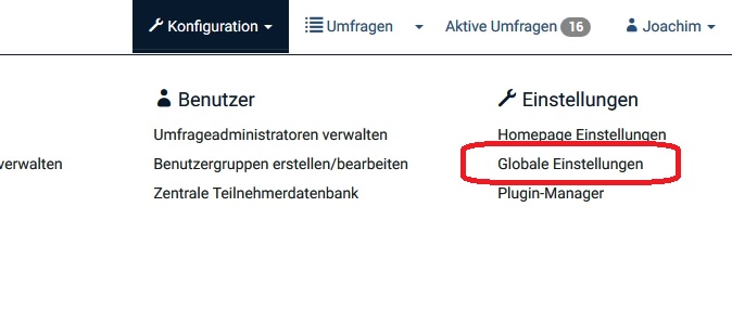 vielen Dank für Deine Mühe, den Fehler zu reproduzieren! Die "Globalen Einstellungen" > "E-Mail-Einstellungen" finde ich leider nicht. Entweder habe ich Tomaten auf den Augen (sorry, bin noch Anfängerin) oder ich habe keine Berechtigung in meiner LS-Konfiguration? Habe mich für letzteren Fall mit der Frage an unsere Administration gewendet.