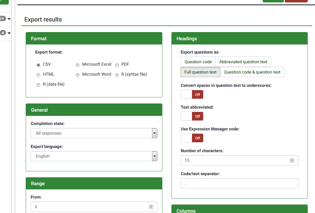 Die demo.limesurvey.org ist noch auf 3.4.1. Da konnte ich das auch nicht reproduzieren. Da es nur die eine Exportroutine betrifft, kann es auch kein grundsätzliches PHP-Einstellungsproblem sein. Und die Datenmenge scheint gering zu sein.Joffm wrote: Also kann es natürlich sein, dass in 3.4.1. irgendetwas hakte, und ein Update die Sache bereinigt.