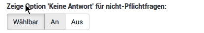 Vorher konnte ich unter den Einstellungen einer Befragung unter dem Menüpunkt "Präsentation" zeige "keine Antwort" - "AUS" einstellen. Wenn ich das jetzt tue und anschließend wie gehabt rechts oben auf "speichern" gehe, springt mir die Einstellung wieder auf "AN" zurück, egal, wie oft ich mich einlogge. Kennt jemand dieses Problem? Anscheinend gab esjetzt ein Update für LimeSurvey Professional, vl hat das den Fehler behoben? Wie kann ich das installieren oder ist das in dem Fall automatisch installiert, wenn ich eh das online-Hosting von LimePro verwende?