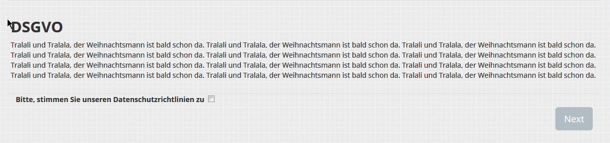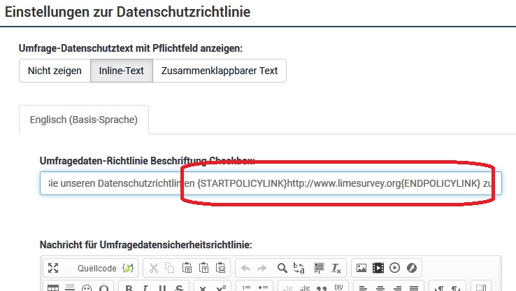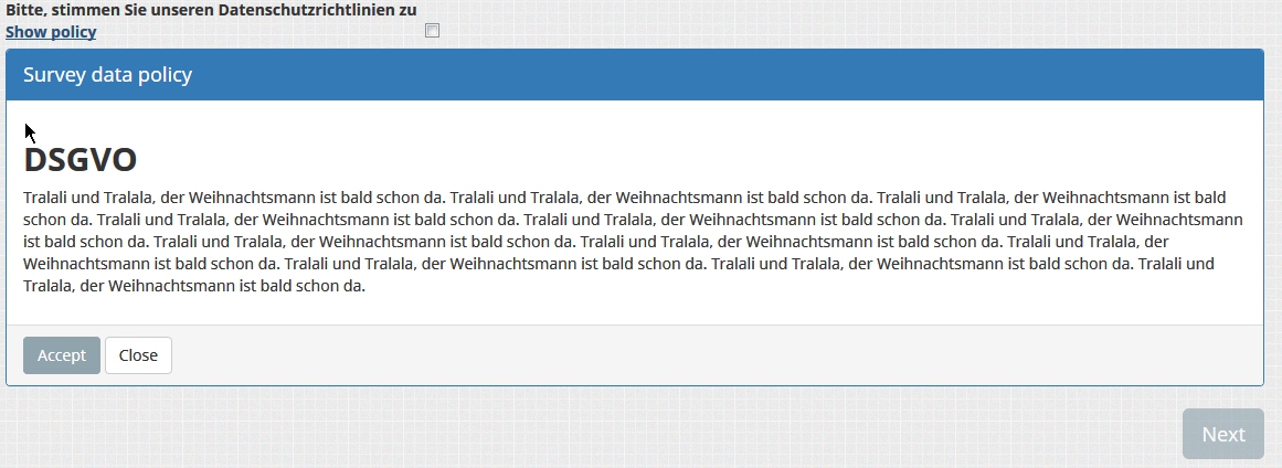 Bitte, stimmen Sie unseren Datenschutzrichtlinien {STARTPOLICYLINK}https://www.limesurvey.org{ENDPOLICYLINK} zu
