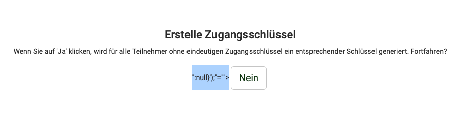 ich habe für eine Umfrage eine Teilnehmerliste aus einer csv datei eingelesen, was auch prima geklappt hat. Für die Teilnehmenden möchte nun Zugangsschlüssel erstellen. Wenn ich den Punkt Zugangsschlüssel generieren aufrufe wird mir aber nur nein angeboten. anstatt dem Button ja erscheint sowas: