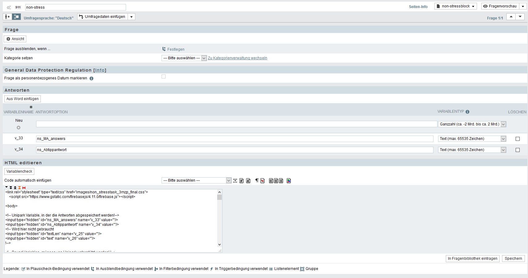Im Kern: Wie die Daten von seinen Javascriptprogrammen in selbstdefinierte Variablen in LimeSurvey gespeichert werden können. Und der Übergang zwischen anderen Fragen und seinen JS-Programmen in LimeSurvey gemeistert werden kann.Joffm wrote: Ich weiß jetzt nicht, welche Antwort Freihaut erwartet?