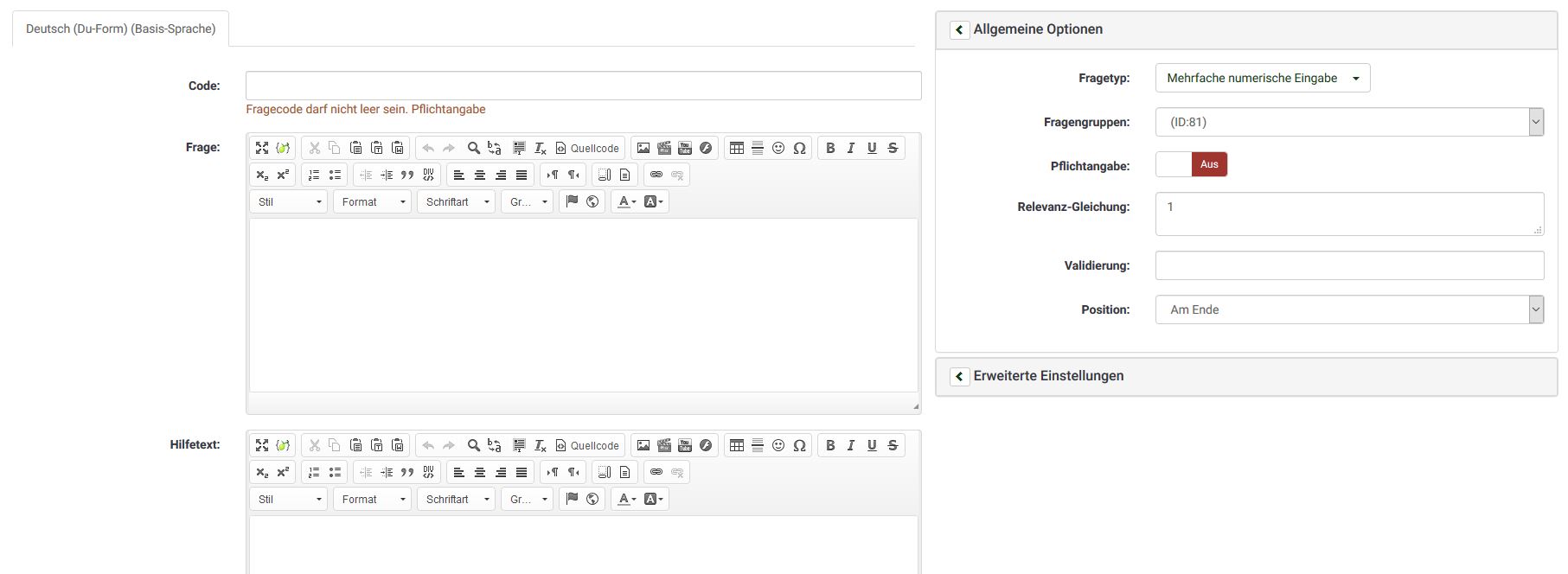 Also man generiert eine neue Frage, der Typ: mehrfache numerische Eingabe und dann sollte man irgendwo das Layout ändern können, aber ich finde es nicht.