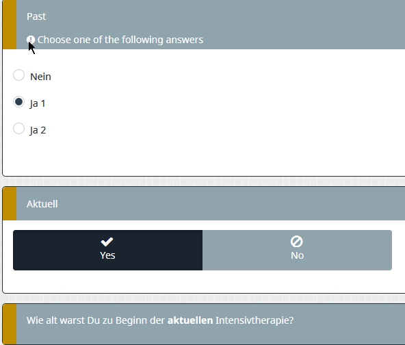 Das Tailoring scheint bei mir nur für einzelne zusätzliche Formulierungen zu funktionieren (z.B.: Wann hat Deine if(ITpast > 0, "aktuelle") Intensivtherapie begonnen?), jedoch nicht für entweder/oder - Formulierungen.
