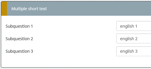 Ich habe eine Umfrage mit Basissprache Deutsch und zusätzlicher Sprache Französisch. Wenn ich bei einer "mehrfache kurze Texte" Frage die Vorgabe-Antworten der Teilfragen in beiden Sprachen erfasse und dann die Umfrage starte, werden sowohl in der DE- wie auch in der FR-Variante jeweils nur die DE-Vorgabe-Antworten angezeigt.