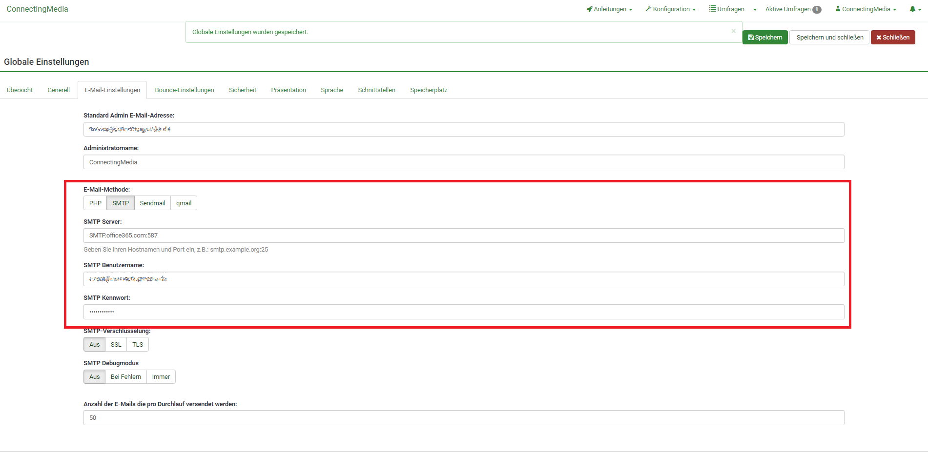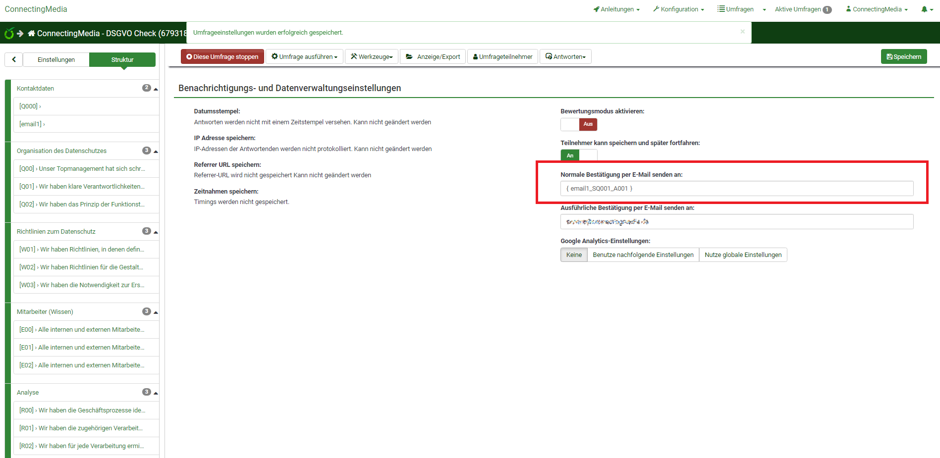 Was sind denn Bestätigungsmails?ConnectingMedia wrote: Allerdings bekomme ich nur die Normalen und Ausführlichen Admin Benachrichtigungen jedoch keine Bestätigungsmails, auch nicht wenn ich andere Mails in die umfrage eintrage, woran könnte das liegen?