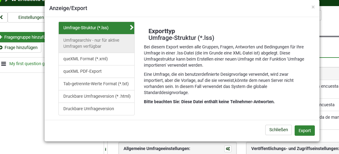 vielen Dank für deine schnelle Antwort. Was genau meinst du mit .ISS? Meinst du die exportierte Fragegruppe? Ich bin noch neu hier und nutze LimeSurvey das erste mal, entschuldige