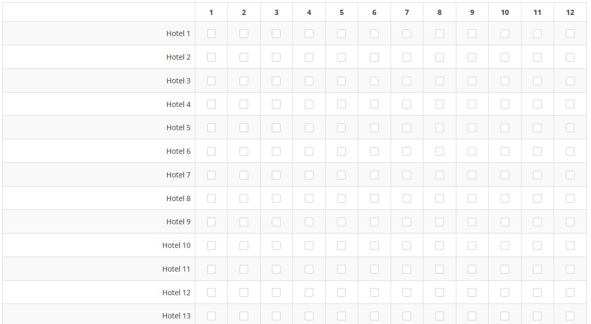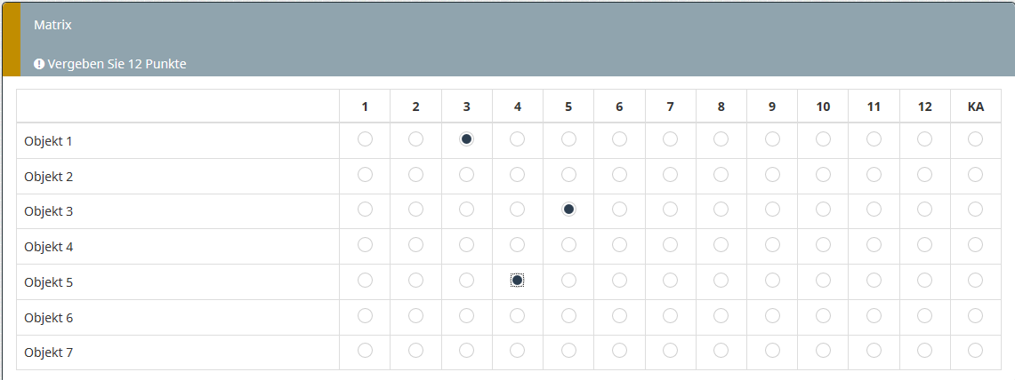 in einer Frage vom Typ Matrix kann man nur eine Auswahl pro Spalte treffen.Ich dachte, ich setze das mit einer normalen Matrix-Frage um, allerdings kann man dort ja jede Spalte beliebig oft auswählen
