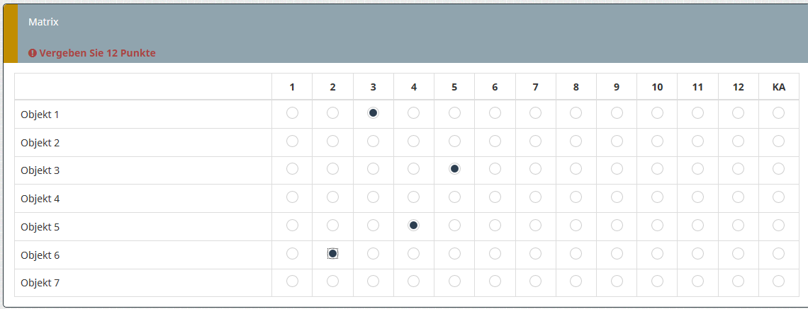 Soll das heißen, es werden 78 Punkte verteilt, also jeder Wert von 1-12 je einmal? Dann musst Du eben validieren auf summe==78 und Werte "unique". Das wird dann aber nicht klappen, falls mehrmals "KA" geklickt wird.Darauf dürfen jeweils einmal die Punkte 1 - 12 verteilt werden