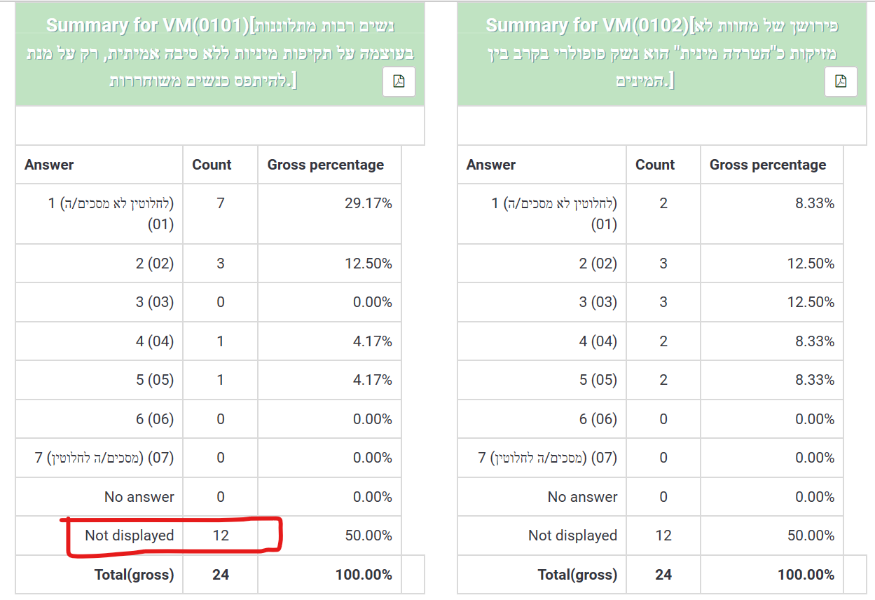 Jetzt schaue ich mir die bisherigen Statistiken an, und sehe, dass es ein Problem verursacht hat, und zwar, steht bei den ersten 13 Probanden die Bezeichnung "Not Displayed" (Siehe Bild 1). Wenn man sich das näher anschaut, sieht man, dass die alte Codes einfach zu keiner Rubrik reinpassen und deswegen nicht klassifiziert werden können. Bei den anderen Probanden, die den Fragebogen nach der Veränderung ausgefüllt haben, besteht kein Problem.