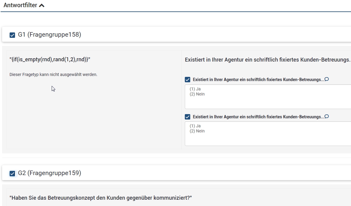 Ich möchte in der Statistik die Fragengruppen G1 und G2 ansehen