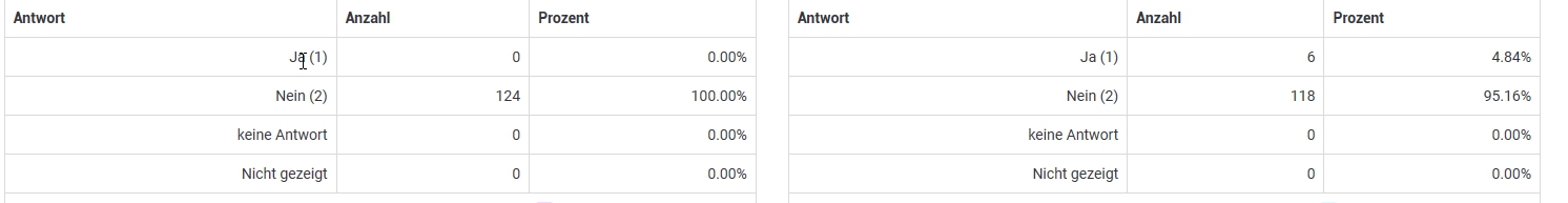 Daher ist klar. Die richtigen Kreuztabellen, Graphiken, statistischen Tests, usw. werden erst nach Ende der Studie und Export der Daten im entsprechenden Auswerte-Tool gemacht, sei es SPSS, PSPP, R, EXCEL, oder was auch immer.