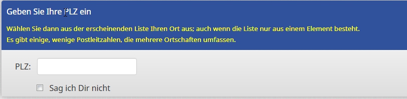 Der Teilnehmende soll seine Postleitzahl in ein kurzes Textfeld (das habe ich schon von Joffm gelernt) eintippen.