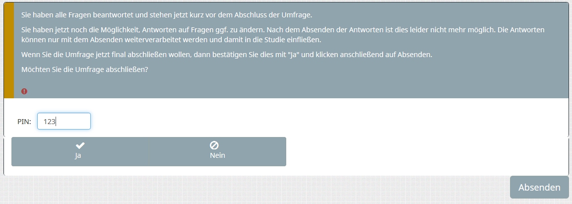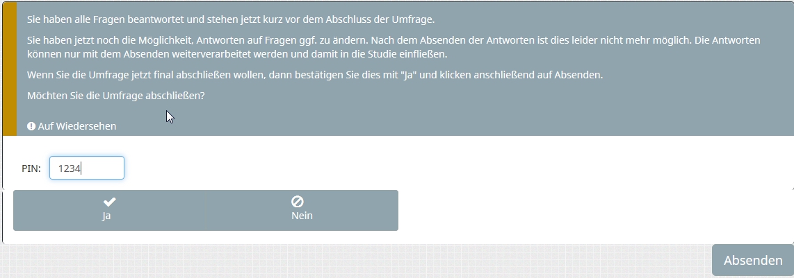 ...<p>Möchten Sie die Umfrage abschließen?</p> <p id="demo"> </p> <input id="numb" /><button onclick="myFunction()" type="button">PIN</button> <script type="text/javascript" charset="utf-8"> var x, text="Geben Sie bitte eine Antwort an."; function myFunction() { // Get the value of the input field with id="numb" x = document.getElementById("numb").value; document.getElementById("demo").innerHTML = text; } $(document).ready(function() { // Hide the submit button $('#ls-button-submit').hide(); // Listener on the yes/no answers $('#question{QID} input:radio').on('change', function(e) { if($('#question{QID} input:radio:checked:eq(0)').val() == 'Y') { if ( x == 1234 ) { text = "Auf Wiedersehen!"; $('#ls-button-submit').fadeIn(500); } else { text = "Falsches Code"; } } else { $('#ls-button-submit').fadeOut(500); } }); }); </script>