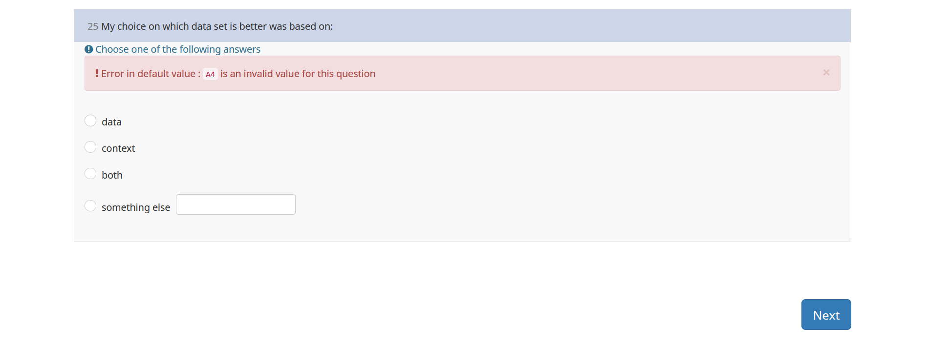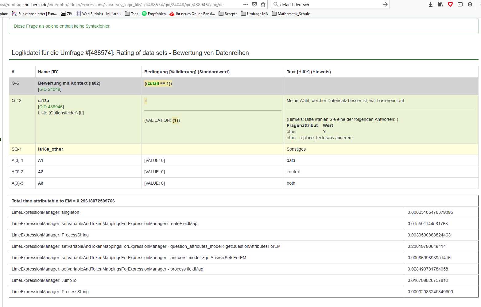 Ich habe mir deine Fragebögen nicht angeschaut. Aber allgemein gesprochen: Standardantwortwerte sind stets über die Oberfläche änderbar. Manche Fragetypen haben diese Funktion nicht.Carsten81 wrote: Mich hätte jetzt noch interessiert, ob es einen eleganteren Weg gibt, den default value einer Frage zu ändern. Ich befürchte, dass sich das wohl nur mit einem Dateiexport und nach Änderung -import realisieren lässt.