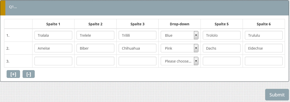 Wie es jedes einfache Tabellenkalkulationsprogramm kann. Allerdings scheint LimeSurvey wohl nicht in der Lage zu sein, so etwas einfaches abzubilden. Daher habe ich mir überlegt, ich baue die Frage um und stelle dann: