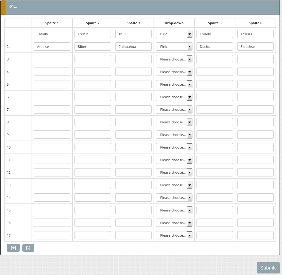 Aber du kannst heute bei dem verwendeten Fragetypen durch die "Relevanz" der Subquestions dafür sorgen, dass die nächste Zeile (subquestion) nur angezeigt wird, wenn die vorherige Zeile ausgefüllt wurde. Dazu gab es im Forum auch schon Beispiele.