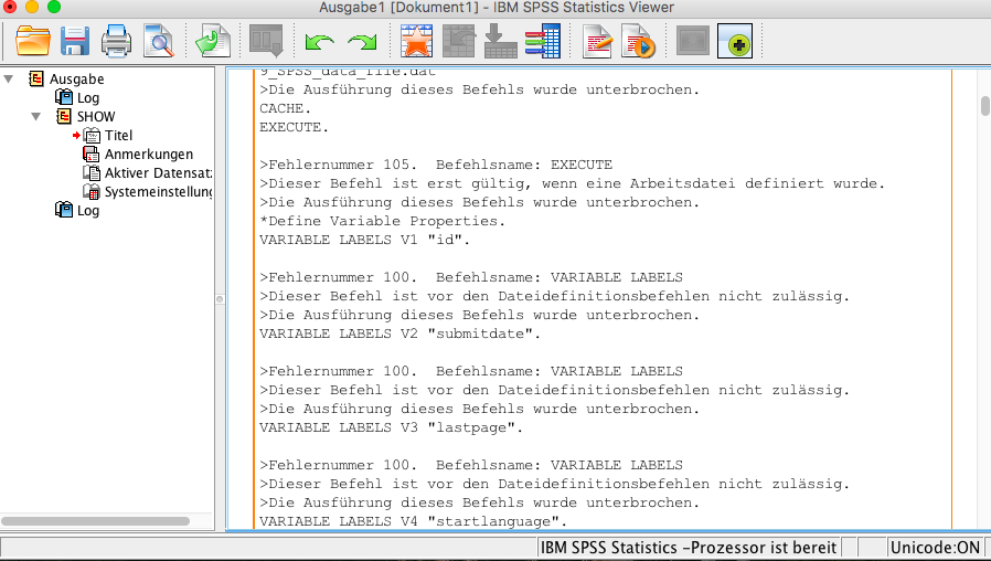 Leider bekomme ich in weiterer Folge aber folgende nur Fehlermeldungen im Ausgabefenster. Der Dateneditor von SPSS öffnet sich zusätzlich nicht bzw. es sind dort keine Daten vorhanden.
