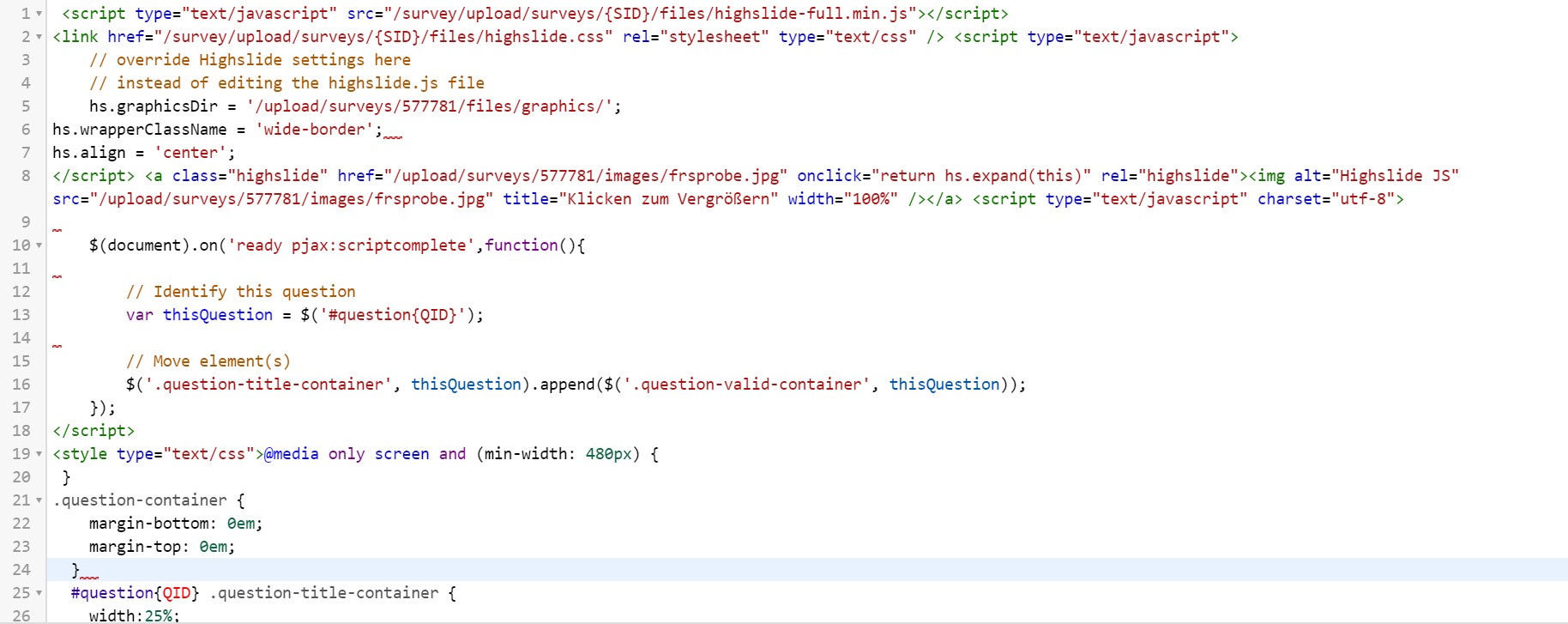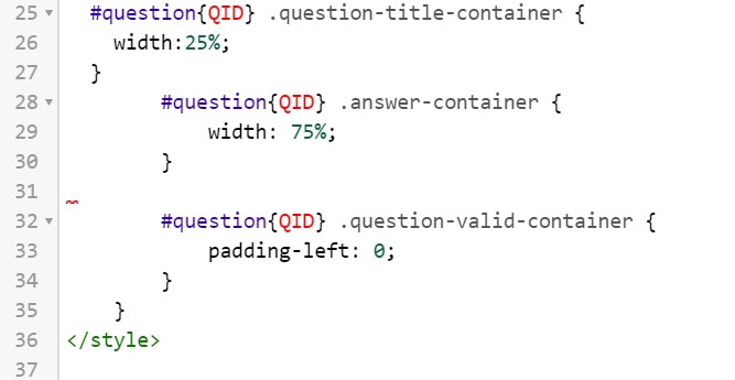 <script type="text/javascript" charset="utf-8"> $(document).on('ready pjax:scriptcomplete',function(){ // Identify this question var thisQuestion = $('#question{QID}'); // Add a question class thisQuestion.addClass('custom-array'); // Column-specific classes $('table.subquestion-list tr', thisQuestion).each(function(i) { $('th, td', this).each(function(i) { $(this).addClass('column-'+i); }); }); }); </script>