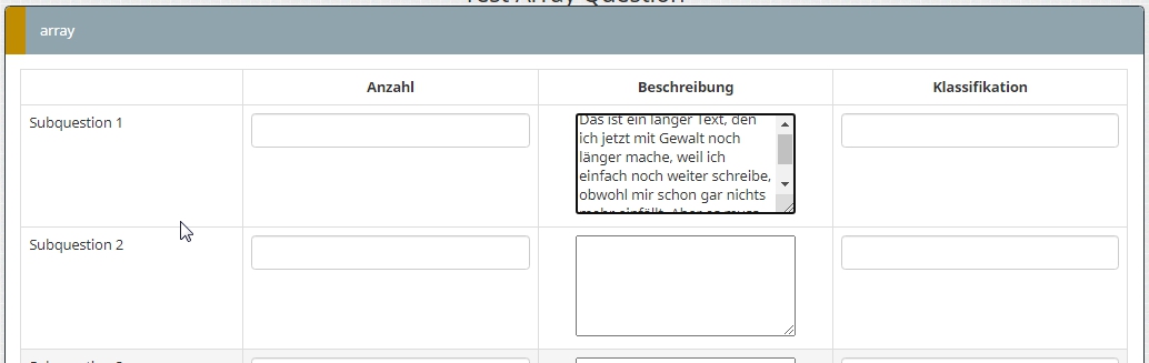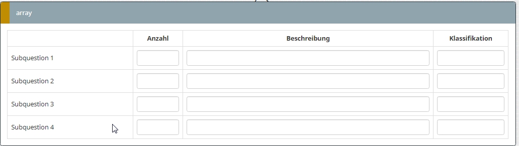 <style type="text/css">.custom-array table.subquestion-list col { width: auto !important; } .custom-array table.subquestion-list thead .column-0 { width: 25%; } .custom-array table.subquestion-list thead .column-1 { width: 10%; } .custom-array table.subquestion-list thead .column-2 { width: 50%; } .custom-array table.subquestion-list thead .column-3 { width: 15%; } </style>