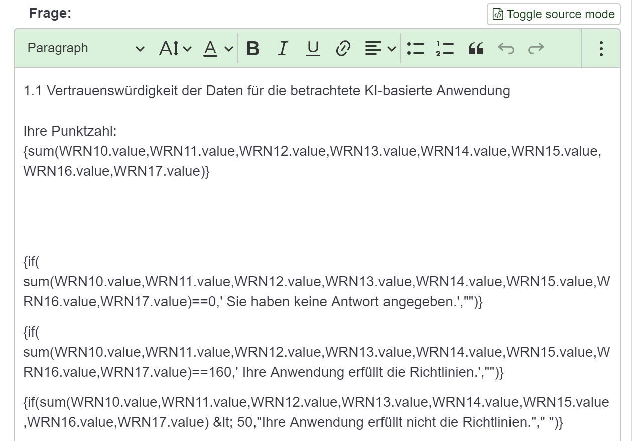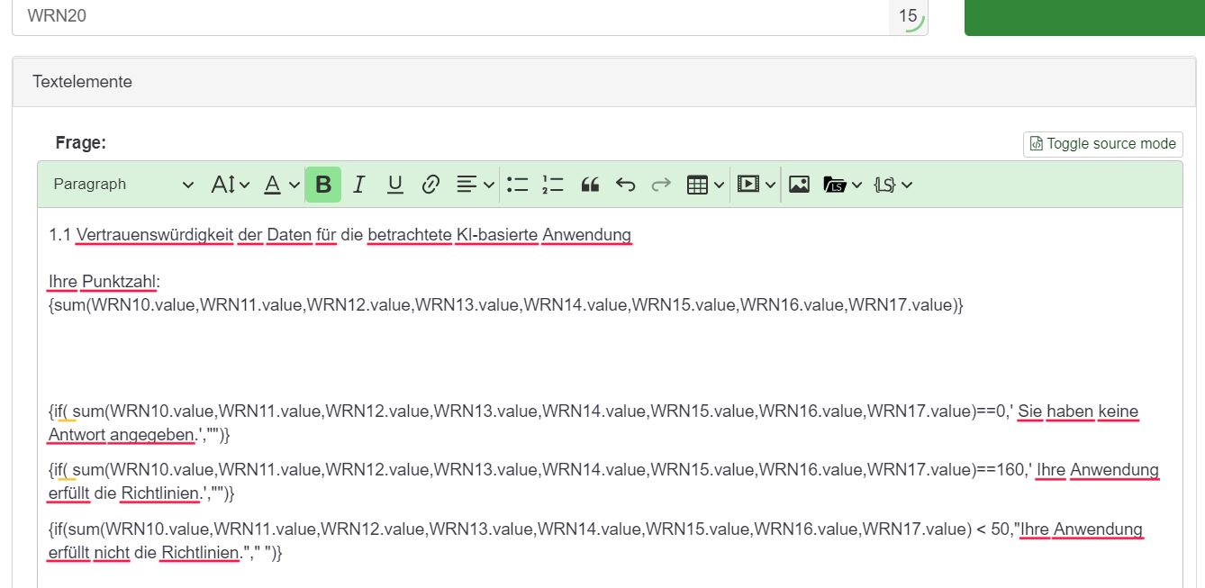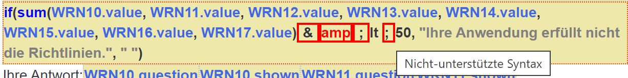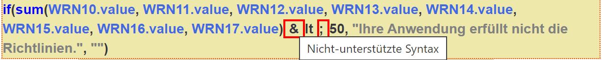 {if(sum(WRN10.value,WRN11.value,WRN12.value,WRN13.value,WRN14.value,WRN15.value,WRN16.value,WRN17.value) < 50,"Ihre Anwendung erfüllt nicht die Richtlinien.","")}
