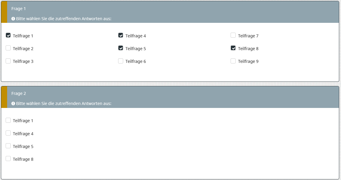 Ich habe eine Mehrfachauswahl mit 19 Antworten. In der ersten Frage sollen die Umfrageteilnehmer ihre Top 10 aus diesen 19 Antworten auswählen. In einer zweiten Frage sollen sie dann aus den von ihnen gewählten Top 10 ihre Top 3 auswählen. Wie stelle ich das an?