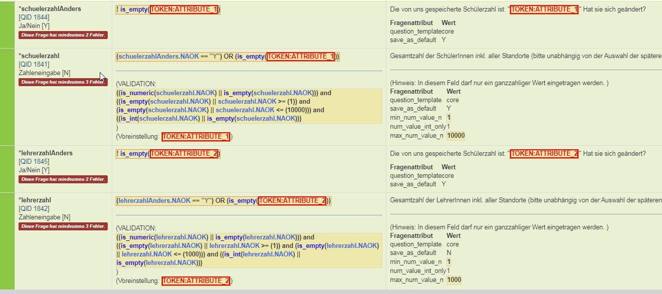 ich habe eine Störung und überlege, ob das ein Bug ist. Sofern ich in den Bedingungen mit Umfrage-Teilnehmer-Attributen arbeite, taucht die Bedingung in den Szenarien nicht auf im Expression Manager. Sie taucht aber in der Question Overview auf unter Bedingung als (is_empty(637572X337X6381.NAOK) Das Verhalten passiert bei Konstanten, aber auch bei anderen Möglichkeiten, die ich in Antwort eintrage solang die Frage "Umfrage-Teilnehmer-Attribute" behandelt. Fragen aus der Umfrage klappen.