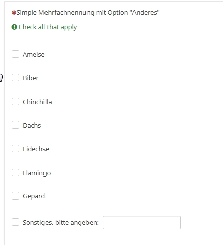 Ich bin gerade dabei eine Online Umfrage zu erstellen. Gerne würde ich eine Liste erstellen, wo Menschen mehrere Antworten auswählen sollen/können und zusätzlich ganz unten die Option haben, eine eigene Antwort zu verfassen unter "sonstiges" oder ähnlichem.