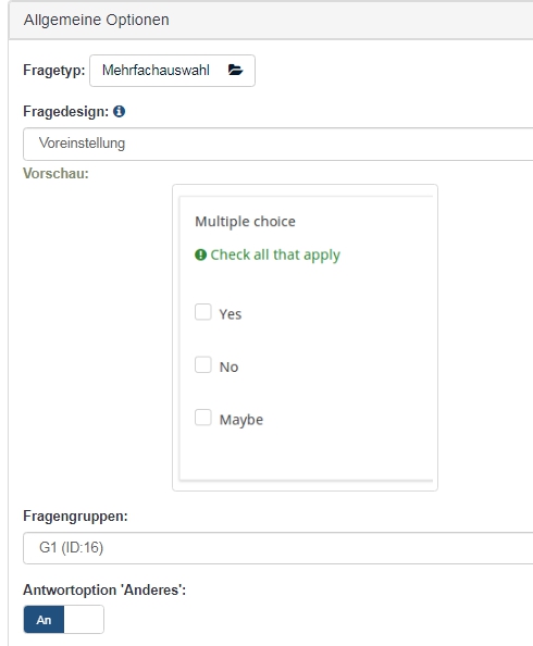 Leider ist bei "Mehrfachauswahl mit Kommentar" überall ein Kommentarfeld hinter, was nicht schön aussieht und bei "Einfachauswahl mit Optionsfeld" kann man nur eine Antwort auswählen.