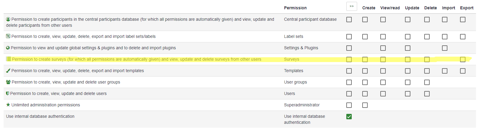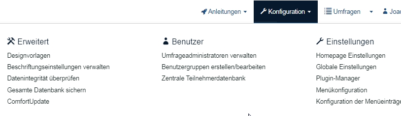 Soweit ich das verstanden habe, sollte das aber ein Nutzungsaccount mit hohen Rechten sein und ich kann auch ganze Befragungen erstellen, kopieren und löschen, nur eben keine Fragen oder Fragengruppen.