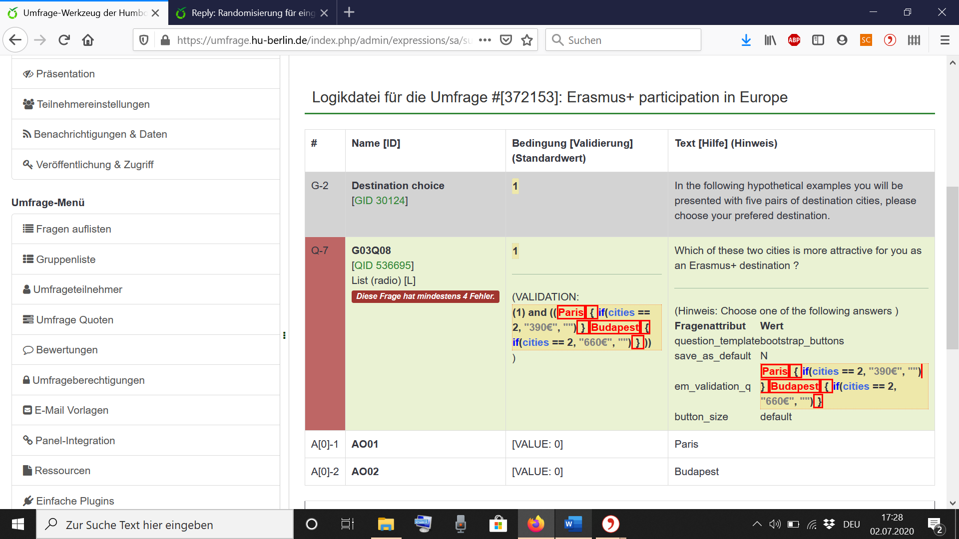 Was würde hier passieren? Wenn die Zufallszahl 2 ist, dann zeigt Limesurvey das folgende an: