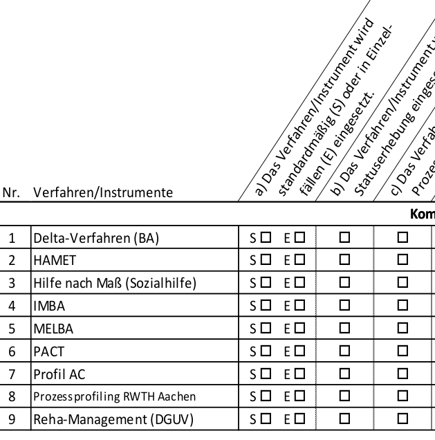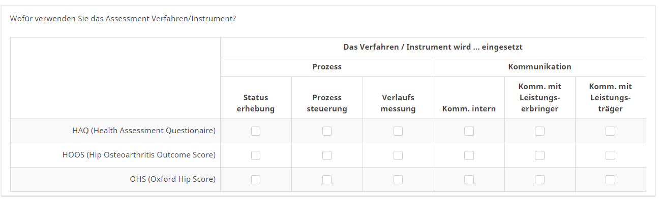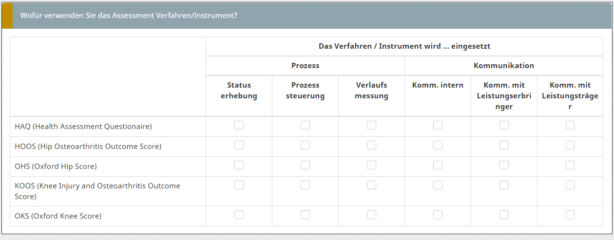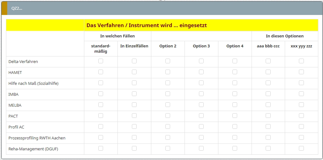 <script type="text/javascript" charset="utf-8"> $(document).on('ready pjax:scriptcomplete',function(){ // Insert the column categories $('#question{QID} table.subquestion-list thead tr:eq(0) td:eq(0)').remove(); $('#question{QID} table.subquestion-list thead').prepend('<tr class="ls-heading">\ <td rowspan="2" colspan="1" style="border-top:0 !important;"></td>\ <th class="answer-text inserted-header" colspan="2">In welchen Fällen</th>\ <th class="answer-text inserted-header" colspan="3"></th>\ <th class="answer-text inserted-header" colspan="2">In diesen Optionen</th>\ </tr>'); $('#question{QID} table.subquestion-list thead').prepend('<tr class="ls-heading">\ <td rowspan="1" colspan="1" style="border-bottom:0 !important;background-color:yellow"></td>\ <th class="answer-text inserted-header" colspan="7" style="text-align:left;font-size:14pt;color:maroon;background-color:yellow">Das Verfahren / Instrument wird ... eingesetzt</th>\ </tr>'); }); </script>