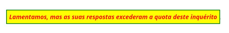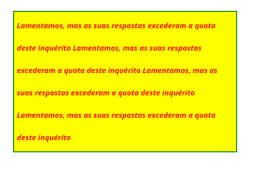 <span style="color:red;font-size:20pt;font-style:italic;background-color:yellow;border:3px solid green;padding:10px;">Lamentamos, mas as suas respostas excederam a quota deste inquérito</span>.
