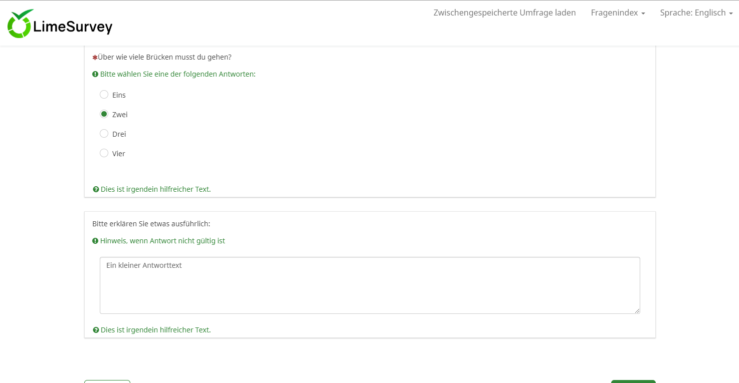 Zumindest hat mir die Demo-Umfragenerstellung auf der LimeSurvey Seite schon besser gefallen, da die Demo-Version aktueller war als unsere 2.5 Jahre alte Uni-Version.